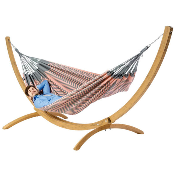 Combined with wooden hammock stand Bow, made of high-quality and sustainable Scandinavian Norway spruce. Stylish, easy to set up and move. This hammock with wooden stand is a true addition to your furniture.
