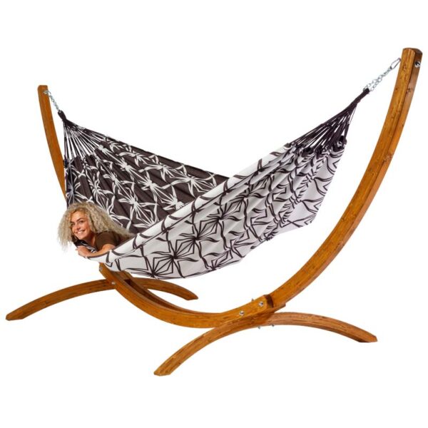 Combined with wooden hammock stand Bow, made of high-quality and sustainable Scandinavian Norway spruce. Stylish, easy to set up and move. This hammock with wooden stand is a true addition to your furniture.