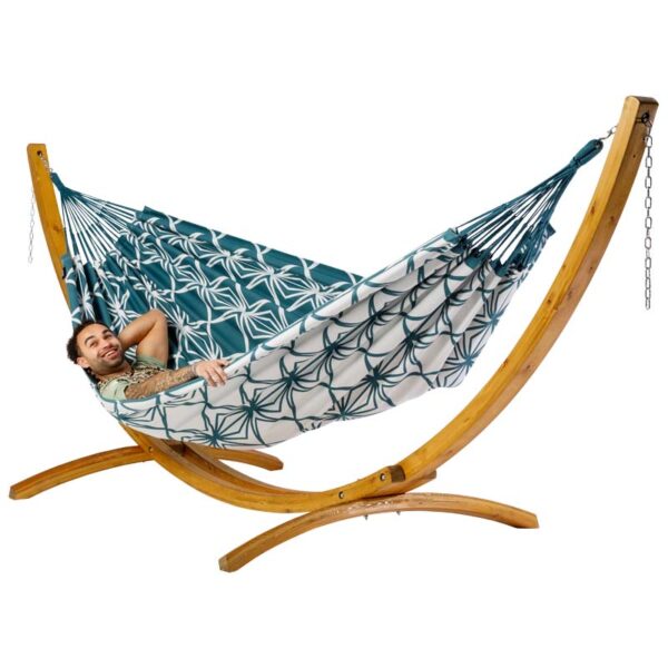 Combined with wooden hammock stand Bow, made of high-quality and sustainable Scandinavian Norway spruce. Stylish, easy to set up and move. This hammock with wooden stand is a true addition to your furniture.